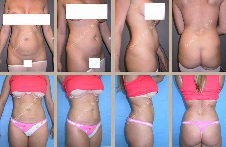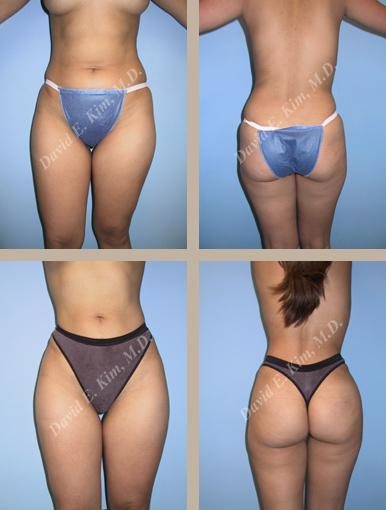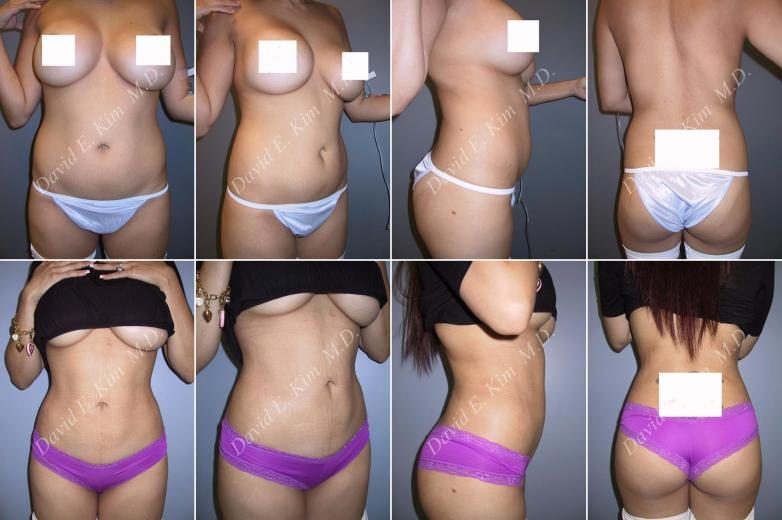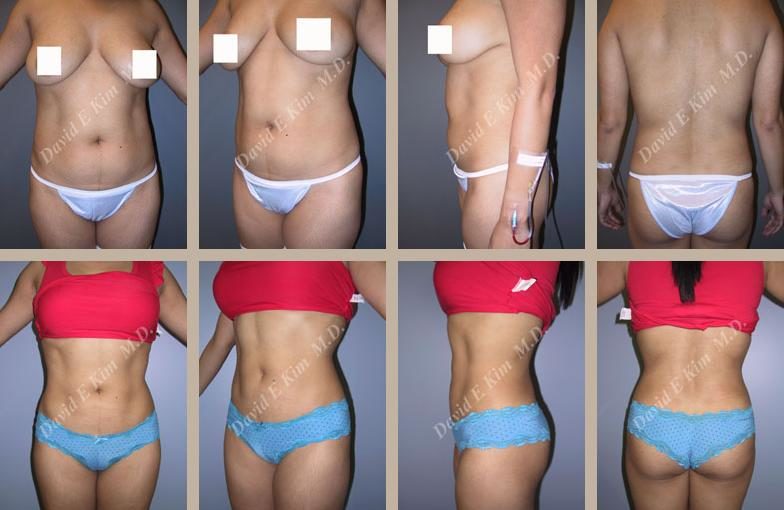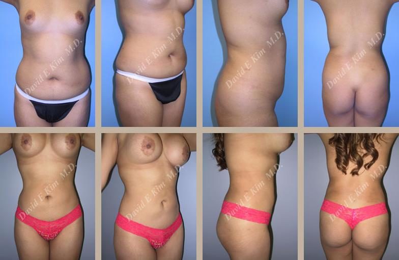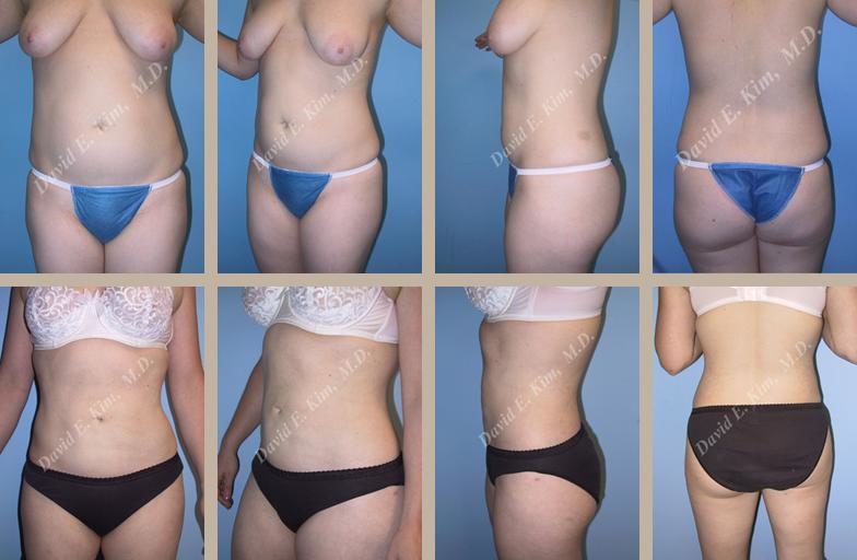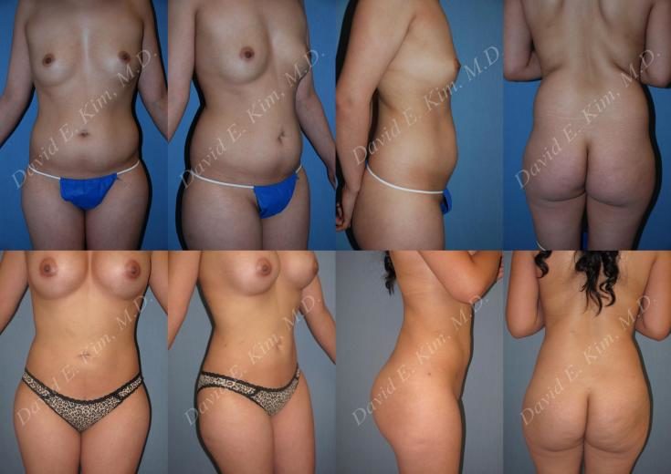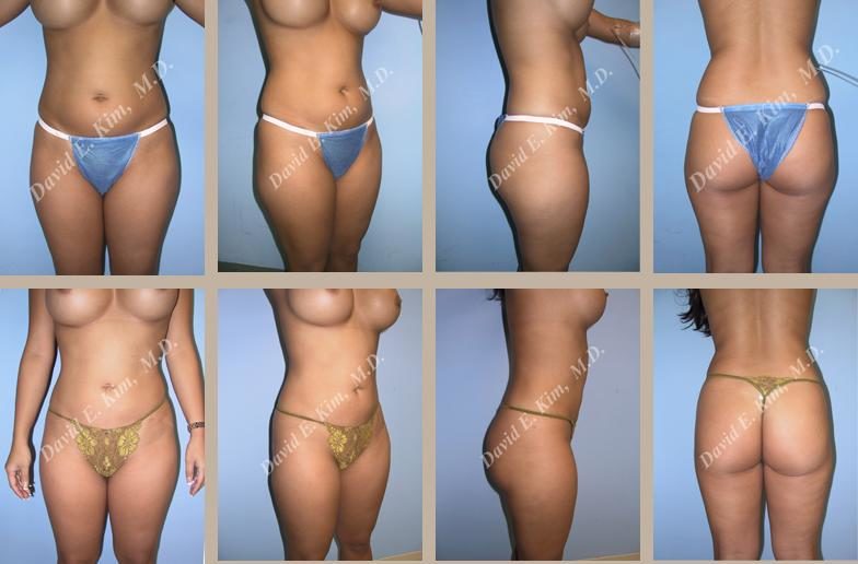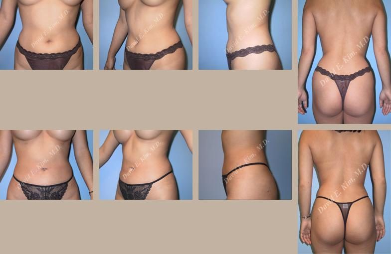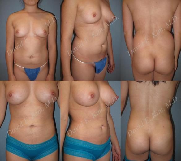 This patient had liposuction to the abdomen and flanks and fat transfer to the buttocks and breast augmentation.