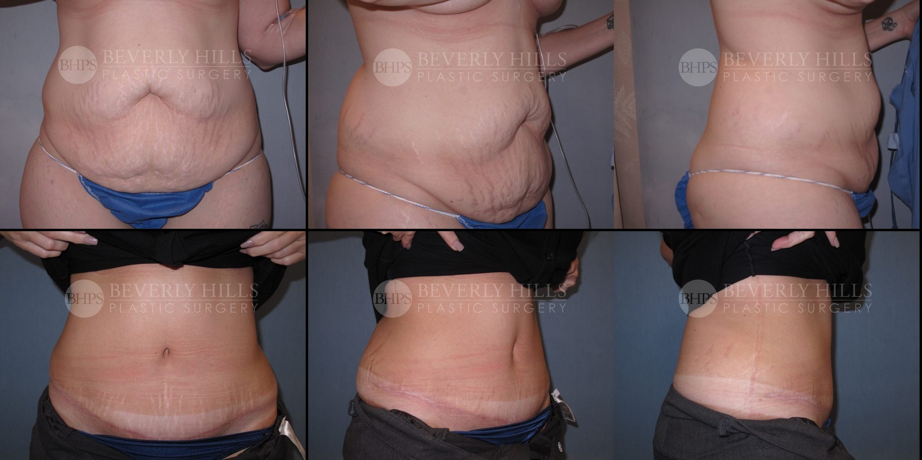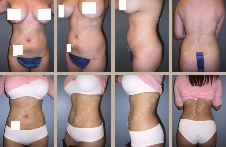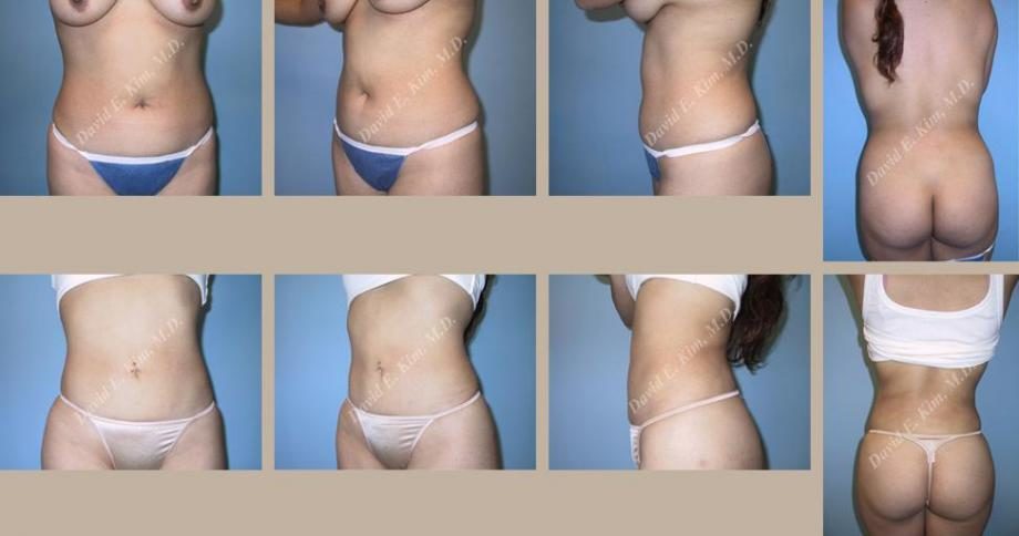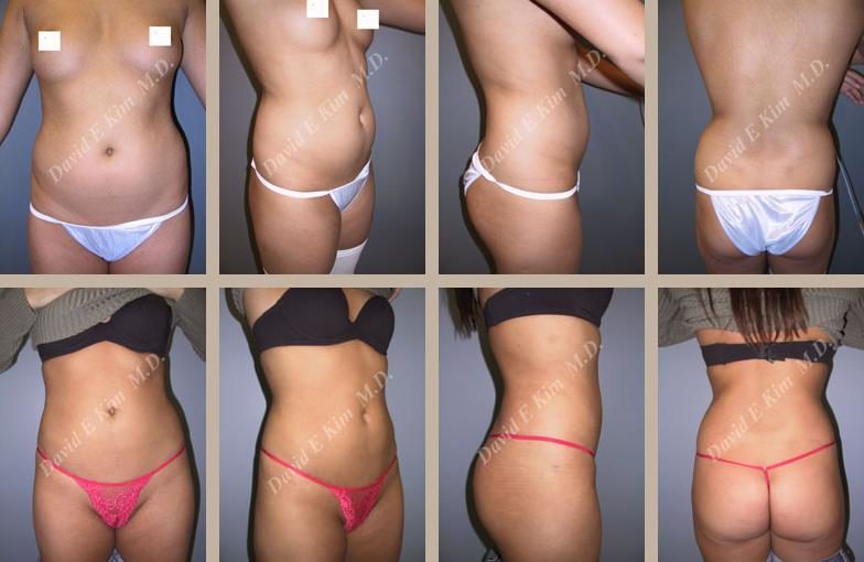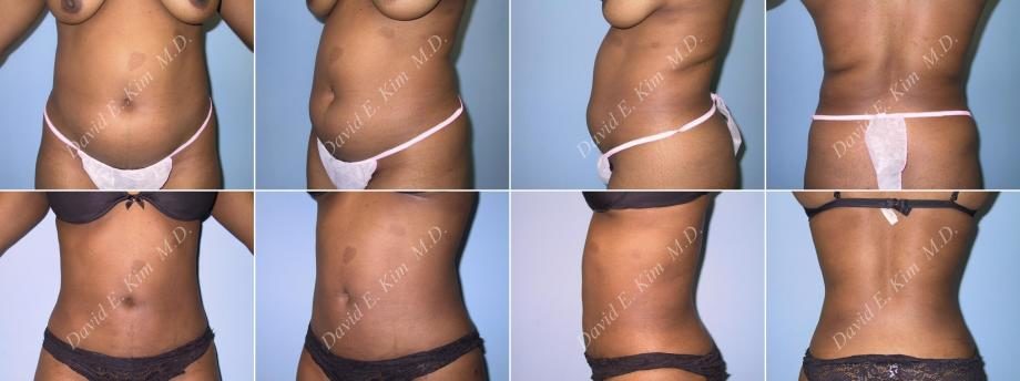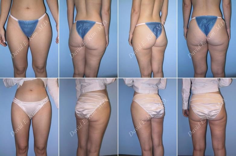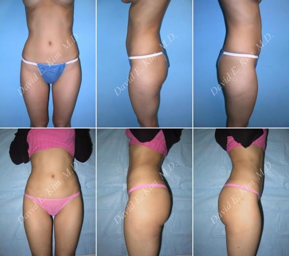 This patient had liposuction to the abdomen and flanks and fat transfer to the buttocks and breast augmentation.