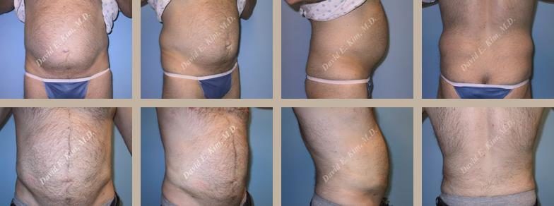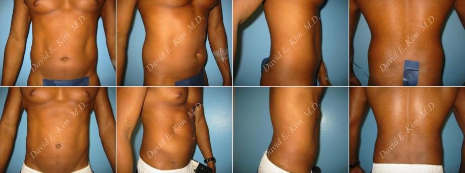 This patient had liposuction to the abdomen and flanks after previous liposuction by another doctor, scars on the back are from previous surgery.